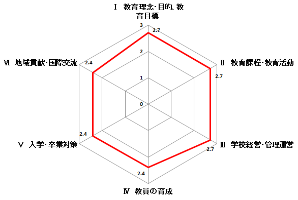 学校評価では、大項目Ⅱ・Ⅲ・Ⅴ・Ⅵの4項目が、昨年と比べ、上昇した。Ⅱ 「教育課程・教育」・Ⅲ「学校経営・管理運営」の項目において上昇した背景には、コロナ禍の状況下であったからこそ、個々が学習・教育環境について考え、授業の工夫を行ったことも大きい。さらに、本校は、実習室の教材備品の体制も整っており、柔軟に対応でき、臨地での学びにスムーズに繋ぐことができたと考える。今後は、感染対策を継続しながら、カリキュラム改正に向けて、教育課程・教育活動を見つめ直し、更に時代の要請に合うように教育課程を考えていく事が必要である。Ⅴ 「入学・卒業対策」は、入学時より卒業時を見据えた学生支援を行っている。また、各学年、資格取得に向けた対策を実施している。Ⅵ 「地域貢献・国際交流」は、新築移転して4年目となり、周囲の施設と連携を図りながら、地域の特性やニーズを把握している。コロナ禍の影響で大規模なイベント参加は、困難であると思われるが、地域との連携に向けた取り組みを今後も検討していく。Ⅳ -2 「教員が授業準備のための時間をとれる体制を整えている」は、過去5年の中で一番、ポイントが高い。必要時、テレワークを実施した事や教員が業務内で時間調整しながら、授業準備を行った結果と考える。今後も時間調整しながら、教材準備を行っていく事が必要である。